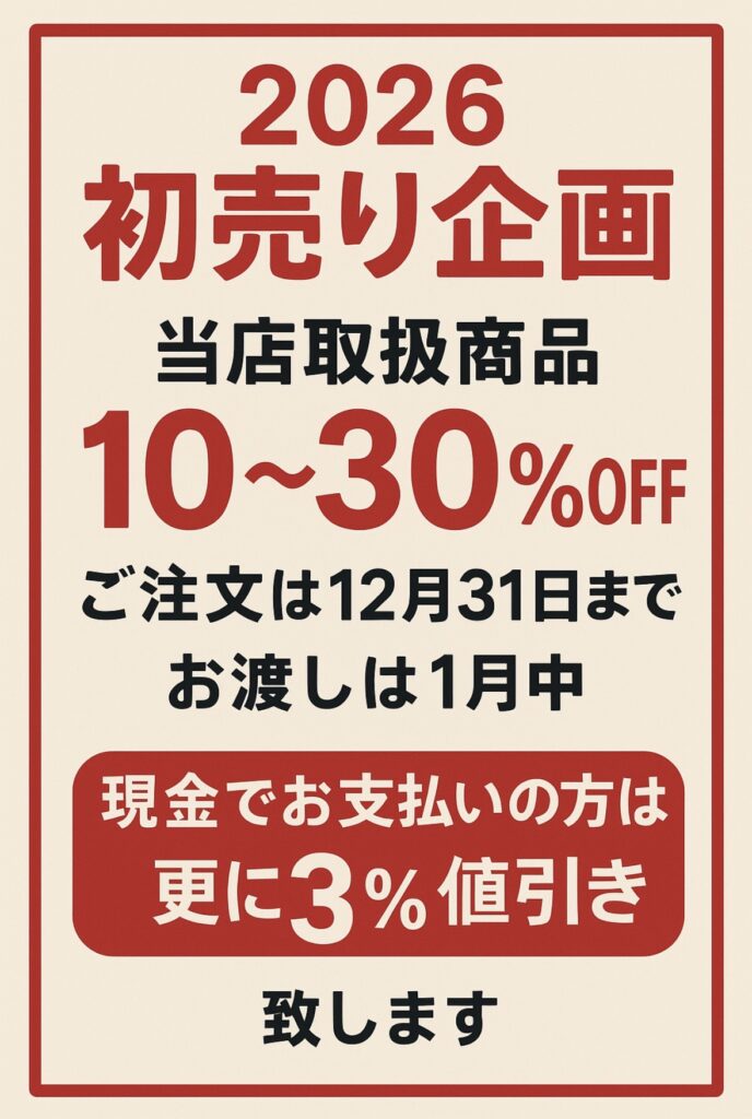 初売り企画、当店取扱商品10〜30%off(一部商品除く)